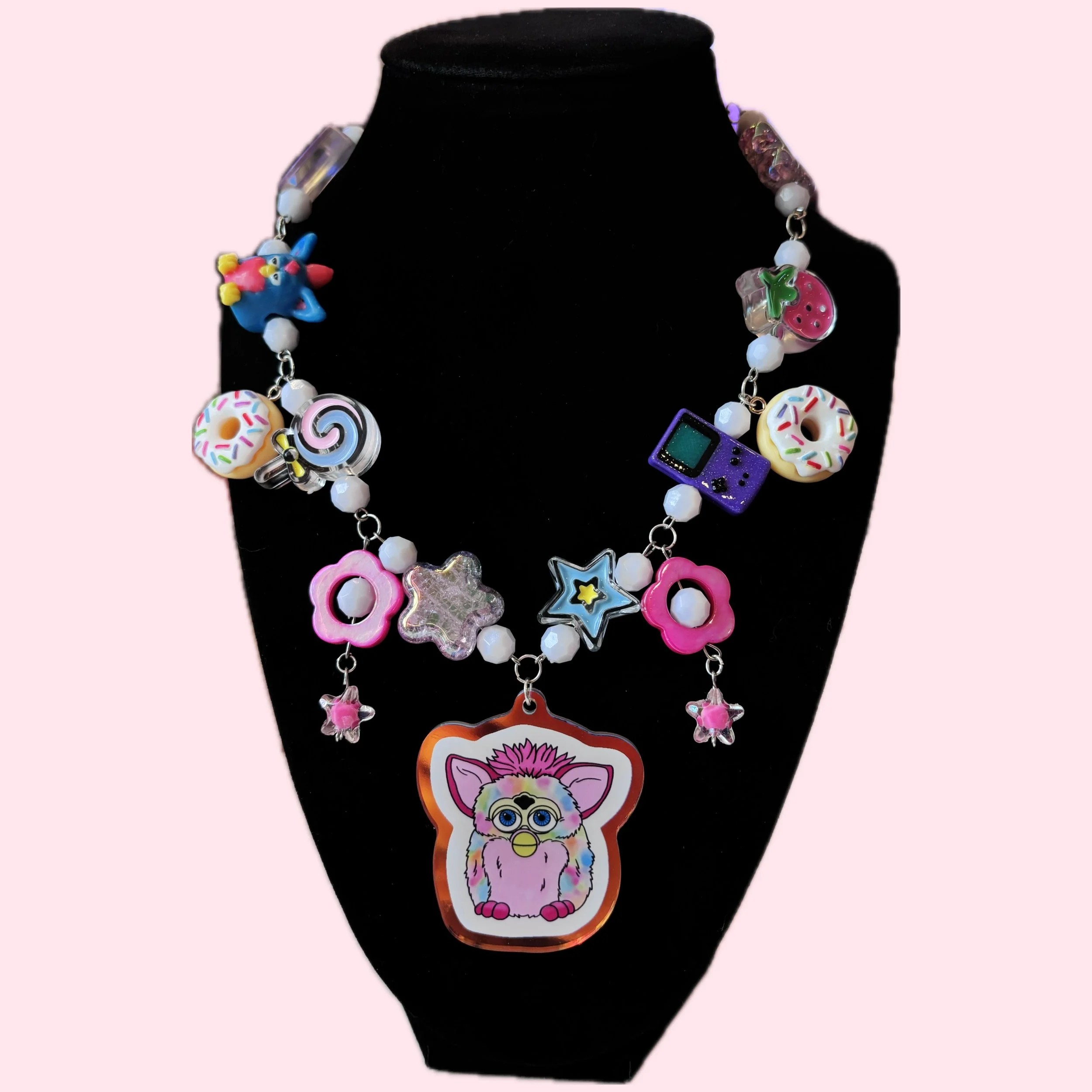 ♡ features charms and beads such as: furby iridescent charm, strawberry, gameboy, candy, furby bead, flowers, etc